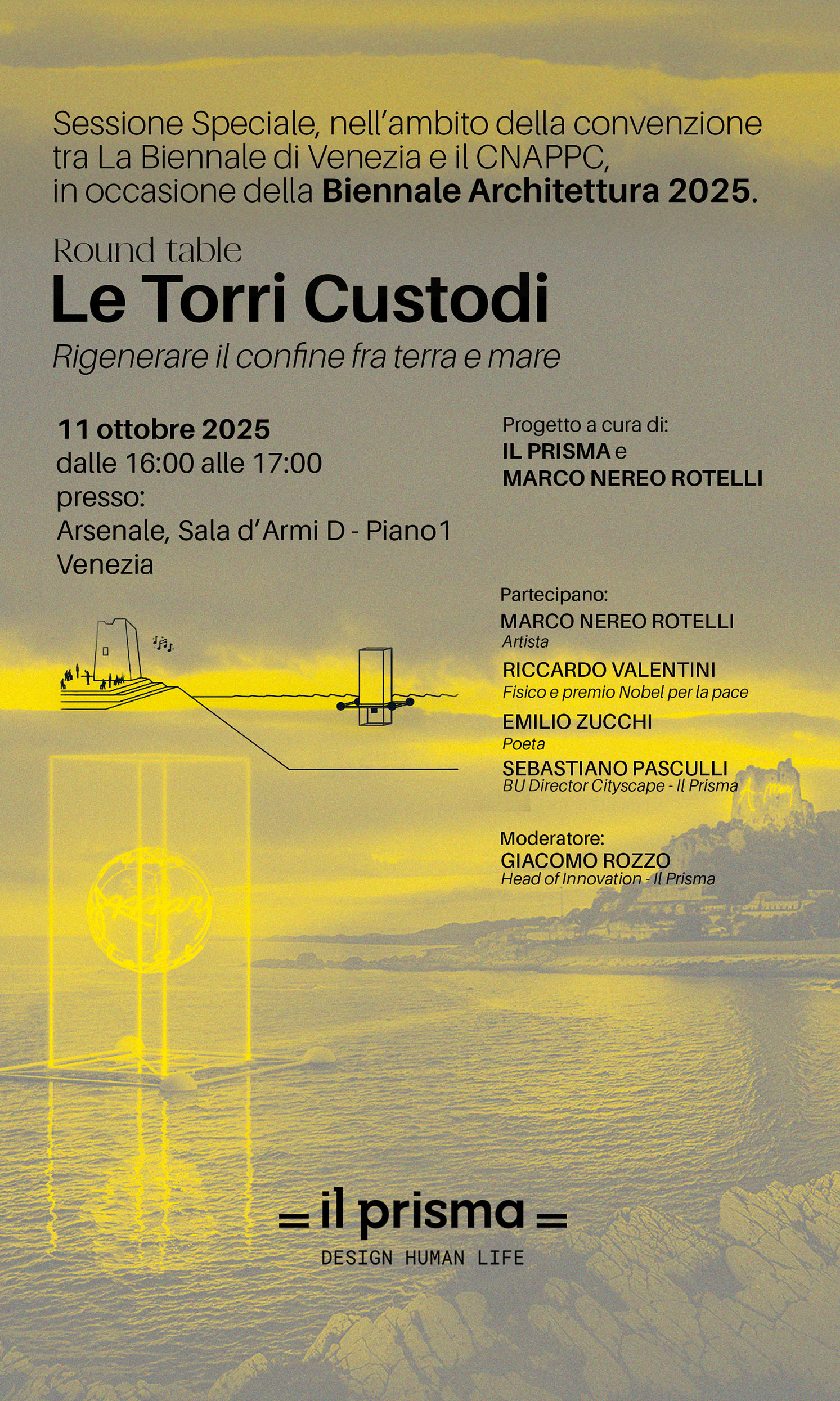 Sabato 11 ottobre, nell’ambito della Sessione Speciale alla Biennale Architettura 2025, Il Prisma e l’artista Marco Nereo Rotelli, presentano all’Arsenale di Venezia la tavola rotonda “Le Torri Custodi – Rigenerare il confine fra terra e mare”: un dialogo aperto tra scienza, arte e poesia.